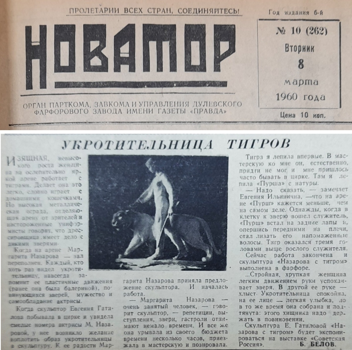 Белов Б. УКРОТИТЕЛЬНИЦА ТИГРОВ // Газета «Новатор», орган парткома, завкома и управления Дулёвского фарфорового завода им. газета «Правда», 1960. – №10 (262) от 8 марта. – С. 2. Изящная, невысокого роста женщина на ослепительно яркой арене работает с тиграми. Делает она это легко, словно играет с домашними кошечками. Но высокая металлическая ограда, отделяющая арену от зрителей и настороженные униформисты говорят, что дрессировщица имеет дело с дикими зверями. Когда на арене Маргарита Назарова – зал переполнен. Каждый, кто хоть раз видел укротительницу, навсегда запомнит её пластичные движения (ранее она была балериной), повинующихся зверей, мужество и самообладание актрисы. Когда скульптор Евгения Гатилова побывала в цирке и увидела смелые номера актрисы М. Назаровой, у неё возникло желание воплотить образ укротительницы в скульптуру. К её радости Маргарита Назарова приняла предложение скульптора. И началась работа. – Маргарита Назарова – очень занятый человек, говорит скульптор,– реп
