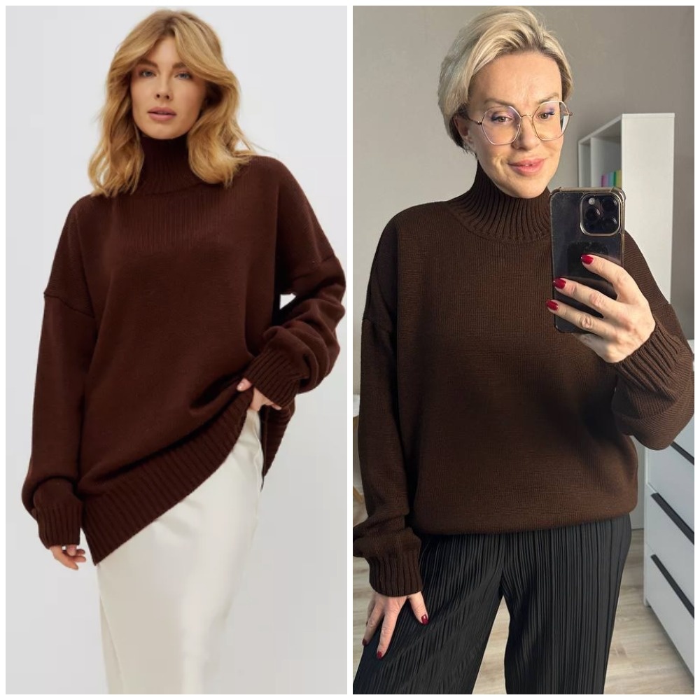 Здравствуйте, дорогие читатели! Меня зовут Ирина, я - стилист, и на этом канале показываю одежду и аксессуары с Wildberries такими, как они есть, то есть, из серии "ожидание/реальность". Мои параметры: рост 169 см, вес 67 кг, 94-74-100 ✅Основной канал: Стильно - не значит дорого! Ставьте лайк в поддержку канала, и давайте смотреть на мою сегодняшнюю покупку. Замечательный свитер свободного кроя с высоким горлом в модном шоколадном цвете (модель также представлена и в других цветах). Очень теплый благодаря высокому содержанию шерсти в составе, при этом цена для такой вещи просто подарочная. Сразу скажу, что не советую носить его навыпуск, так он будет некрасиво обтягивать бедра и ноги из-за резинки по низу. Однако благодаря этой же самой резинке его легко подвернуть, зафиксировав на нужной вам длине. Свитер связан из мягкой, приятной к телу ткани, очень уютный и стильный. Подойдет к сотне ваших образах в самых разных стилизациях. Размеров всего 3, я выбрала самый большой (48-54), на мои