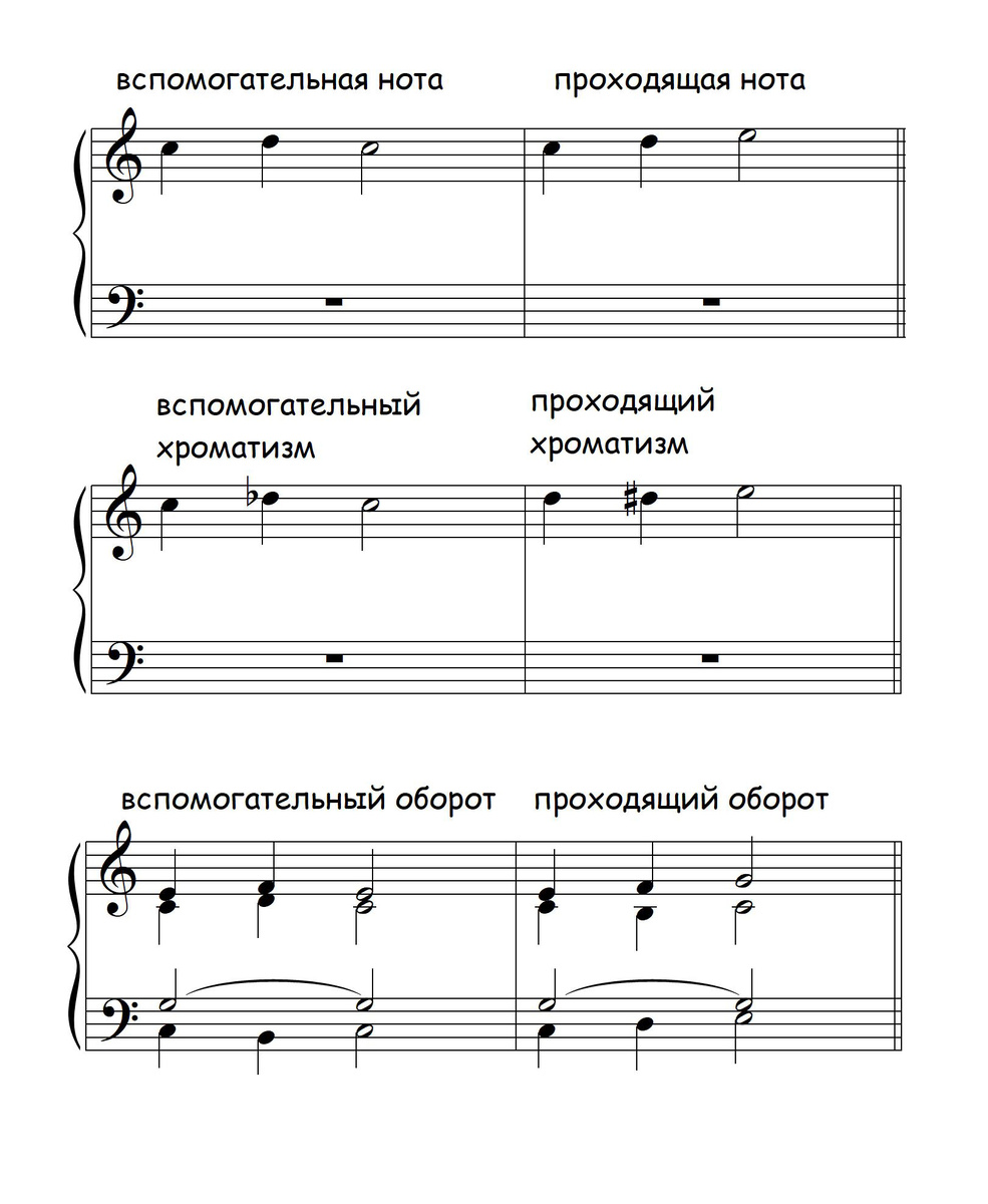 Проходящая нота в диатонике – нота между нотами разной высоты, проходящий хроматизм – заполнение расстояния в целый тон двумя полутонами, проходящий оборот – гармонизация мелодического оборота с проходящей нотой с параллельным или противоположным движением баса.