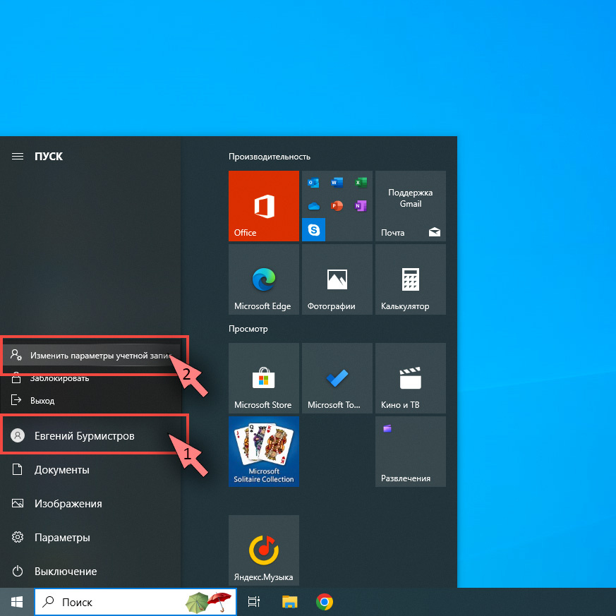 Нажимаем кнопку "Пуск", далее на строку со своей учетной записью и в появившемся меню выбираем "Изменить параметры учетной записи":