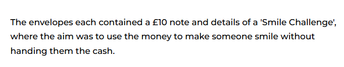 Даже принцы получают в подарок деньги. И даже наличными. Недавно принц Уильям получил неожиданный подарок от ливерпульских школьников – три небольших конверта с небольшой купюрой в 10 фунтов внутри. Правда, конверты не для него, а для его детей – Джорджа, Шарлотты и Луи. И деньги не для них, а для челленджа. Есть такой. Называется Smile Challenge (Челлендж Улыбка). Этот челлендж особенно подойдёт моему младшему сыну – принцу Луи, – почему-то решил Уильям. В общем, в каждом конверте (the envelope) для королевичей была приготовлена банкнота в 10 фунтов стерлингов (a £10 note) и подробное описание ,,Челленджа Улыбка". Его цель (aim) – использовать деньги так, чтобы вызвать у кого-то улыбку (make someone smile). А вот сами наличные ему дарить нельзя. Итак, расширяем свой денежный словарь (Money vocabulary) и запоминаем несколько слов, которые тебе понадобятся, когда речь зайдёт про деньги: Пример: The envelopes each contained a £10 note. Пример: The aim was to use the money to make someone