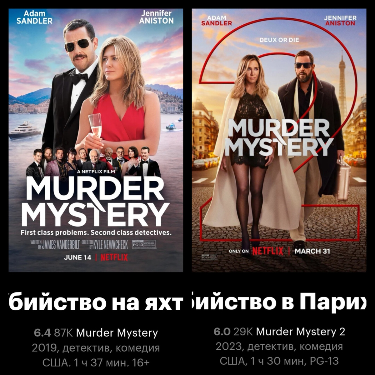 Если вы хотите немного расслабиться и посмеяться, а ещё понаблюдать нща убийствами-расследованиями, то эти два фильма вам подойдут. А ещё в главных ролях Дженифер Энистон и Алам Сэндлер. Супруги Шприц отправляются в медовый месяц в Европу после 15 лет совместной жизни. Но планы кардинально меняются, когда Одри неожиданно заводит в самолёте знакомство с племянником миллиардера, который приглашает их на яхту дяди. В итоге супругов ждет роскошное путешествие на яхте, к которому прилагается убийство, в котором, конечно же, обвинят их. Во второй части супруги Шприц открыли свое детективное агентство, но интересных дел у них не наблюдается. Но тут их друг из прошлой части, Викрам, приглашает их на свою свадьбу на частный остров. Но события закручиваются неожиданным образом и супруги оказываются в самом эпицентре событий. Лёгкие и забавные фильмы, без претензии на шедевр, просто чтобы расслабиться и посмеяться. А что вы смотрите на выходных? #кино #фильмы #выходные #детективы #комедия