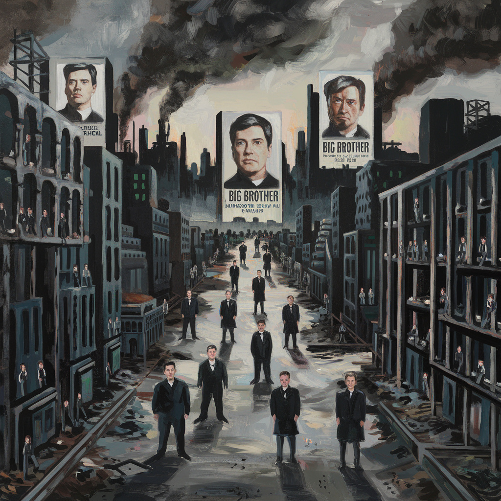 - Всевидящее око: Большой Брат следит за каждым шагом граждан, используя технологии и разветвлённую сеть агентов. Это создаёт атмосферу постоянного страха и паранойи, когда люди не могут быть уверены в своей безопасности даже в собственном доме.
