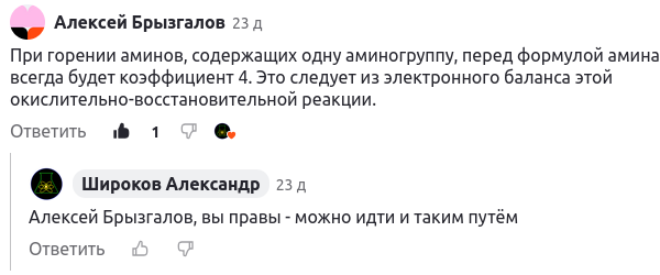 Таким образом выходит, что на взаимодействие с четырьмя молекулами амина всего нужно 4n + (2n + 3) = 6n + 3 молекул O₂ . В итоге получается сбалансированное уравнение горения амина: