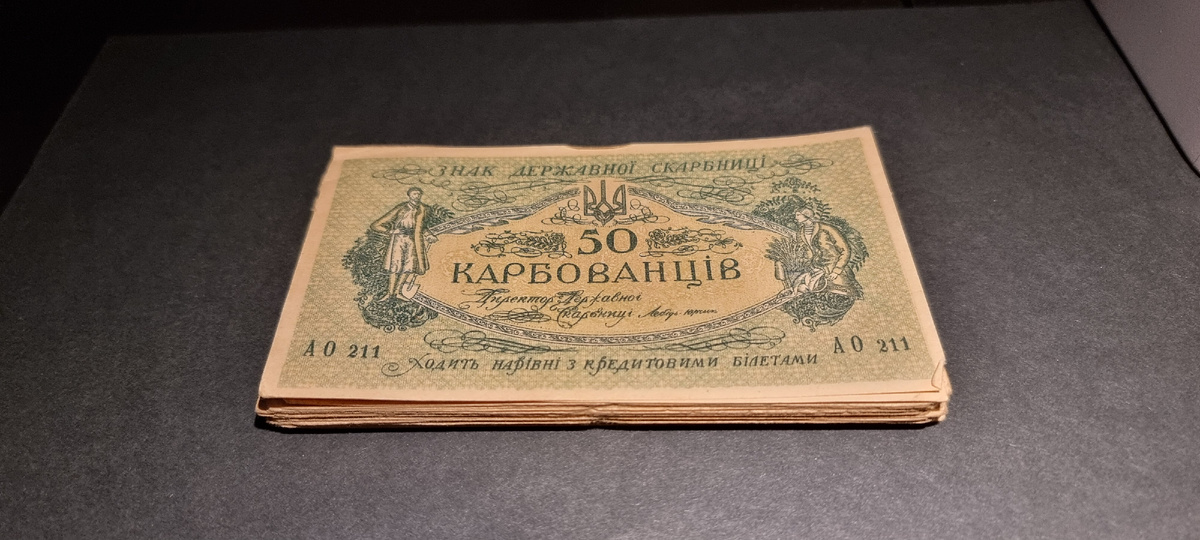 Банкнота номиналом 50 карбованцев 1918 года была выпущена Украинской Народной Республикой (1917–1921) в период Гражданской войны. Печатались в Киеве (типография Кульженко - без серии и с сериями типа АК I, Картографический Отдел Военного министерства - серии типа АК II) и Одессе (Типография Фесенко - серии типа АО). Во время Гражданской войны Одесса неоднократно переходила из рук в руки. В конце 1918 года город был занят войсками Антанты и белогвардейцами. В августе 1919 года Одессу захватили войска Деникина, но уже в начале 1920 года, после успешного наступления Красной армии, город перешел под контроль большевиков. Таким образом, выпуски Одессы можно разделить на следующие: выпуск Украинской Центральной рады - серии АО 189-209, первый выпуск Деникина - серии АО 210-219, первый выпуск Советов - серии АО 220-229, второй выпуск Деникина - серии АО 230-235 и заключительный выпуск Советов - серии АО 236-250. По редкости можно отметить, что достаточно частые - это выпуски Одессы, за исключ