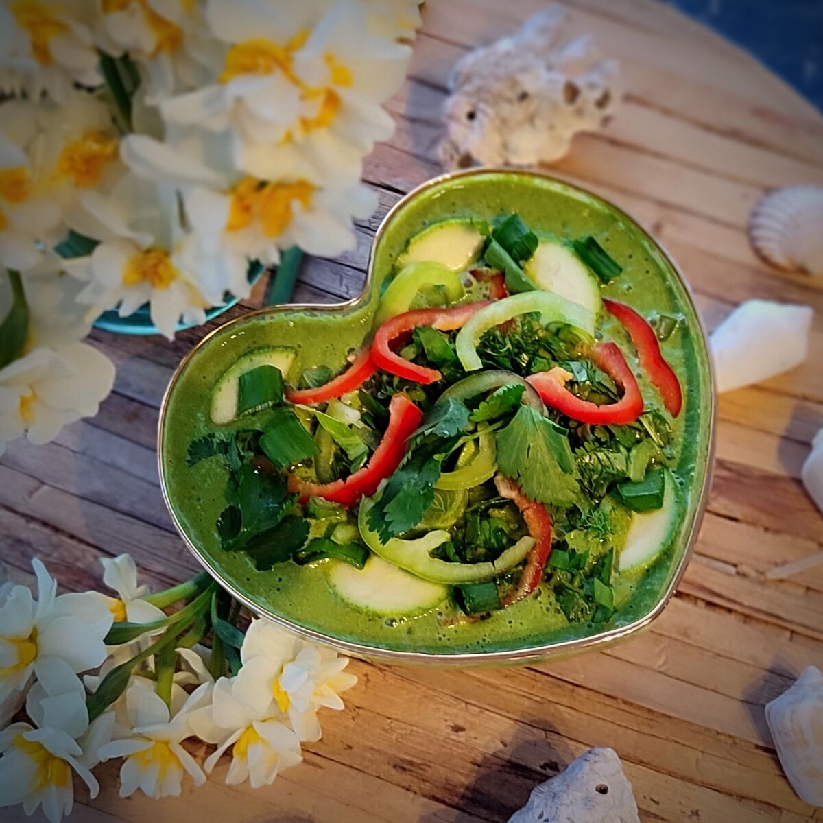 Для подачи (на "пожевать"): кабачок, перец красный и зелёный, кинза, укроп, зелёный лук, 1/2 ч.л. подсолнечных семечек. ⠀ Все ингредиенты для жидкой части супа взбиваем в блендере до однородной гладкой консистенции. Водой регулируем густоту. ⠀ Количество нарезанных овощей и зелени зависит от вашего желания. Я добавила только 3 ст.л. и получился лёгкий супчик. Но если добавить овощей побольше, это будет скорее похоже на салат со шпинатной заправкой.