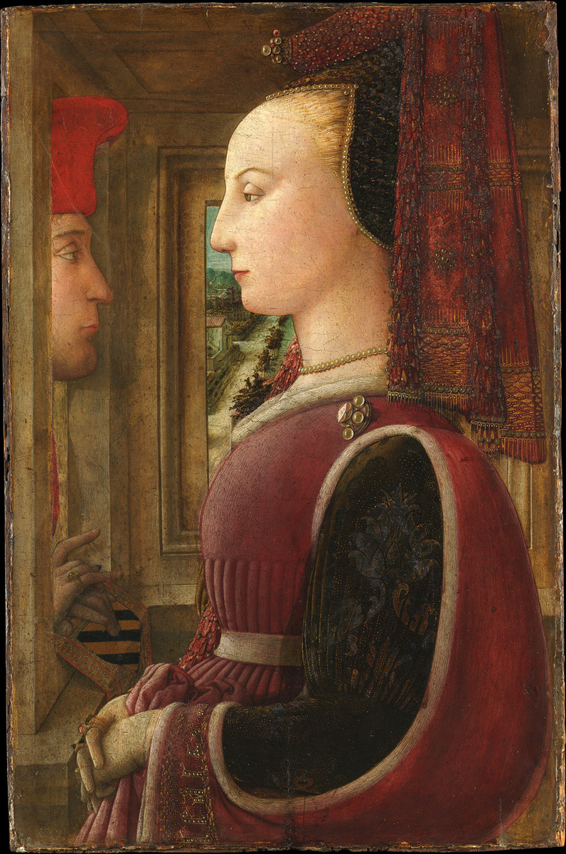 Картина Фра Филиппо Липпи (1406-1469), выполненная в типичном для флорентийских женских профилей стиле Мазаччо (1401-1428), была приобретена английским коллекционером преподобным Джоном Сэнфордом во Флоренции в 1830-м году и продана его потомками американскому миллионеру Генри Маркуанду, который выставлял картину в своем особняке в стиле французского ренессанса в Нью-Йорке, а затем передал её в дар музею Метрополитен. Американский историк искусства Бернард Беренсон в начале 20 века определил моделей как Медичи и Портинари. Но, если присмотреться, можно увидеть, что руки мужчины покоятся на гербе флорентийской семьи Сколари. И эти две фигуры можно довольно достоверно идентифицированы как Лоренцо ди Раньери Сколари и Анджолу ди Бернардо Сапити Они поженились в 1436 году. Считается, что картина, стилистически датируемая концом 1430-х или началом 1440-х годов, посвящена свадьбе супругов или рождению их сына в 1444 году. Картина Липпи является самым ранним независимым женским портретом из