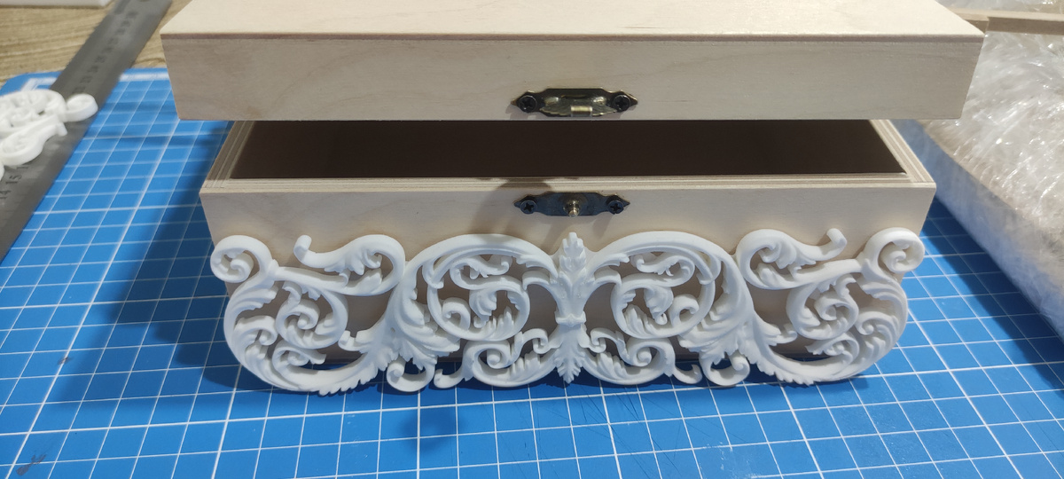 В чем же сложность . Да, отливки подходят по размерам к шкатулке. Но это не боковая сторона . Тут нужно раскроить с запилом под 45°. Для этого я долил ещё пару деталей на случай всяких неожиданностей. Пробовал отпилить угол на торцовочной пиле. Но это был полный провал 🤣🤭. Узор стыкуется только в нескольких точках и очень малой площадью. Потому всё поломало пилой и "щепки" летели во все стороны . Пришлось взять линейку, шаблон из фанерки, карандаш и канцелярский нож. Так начался процесс резки вручную .