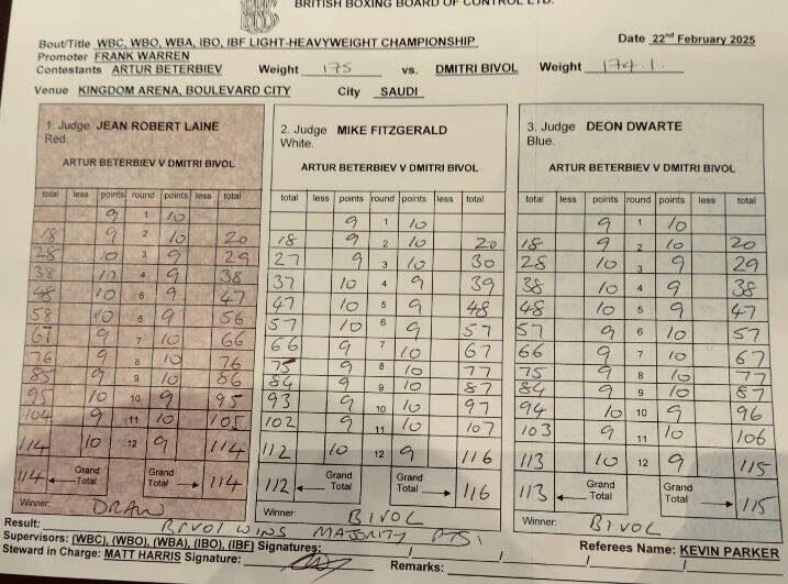 В Эр-Рияде завершился вечер бокса, в главном событии которого Дмитрий Бивол победил Артура Бетербиева решением большинства судей и стал абсолютным чемпионом мира. Судья Джин Лэйн насчитал ничью 114-114. Он отдал Бетербиеву раунды с третьего по шестой, а также 10-й и 12-й. Судья Майк Фитцжеральд отдал победу Биволу со счетом 116-112: на его карточке Бетербиев забрал раунды с четвертого по шестой и 12-й. Судья Деон Дуорт с минимальным перевесом насчитал победу Бивола: Дмитрий был сильнее в первых двух трехминутках, с шестого по девятый и в предпоследнем раундах. Бивол деклассировал Бетербиева в реванше. Мы увидели элитную версию нового чемпиона Бивол разобрался с Бетербиевым в реванше. Новый абсолютный чемпион мира!