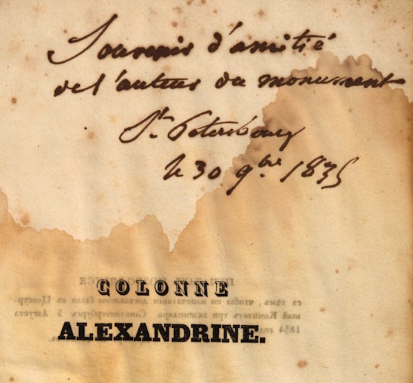 Знакомство с Александровской колонной, наверное, следует начать с азов - с чтения первых статей Монферрана, написанных для публики в процессе создания им памятника Александру I . Эти статьи в разное время были опубликованы в прессе. В 1834 году архитектор собрал их в небольшую книжицу и издал сразу после открытия монумента. Экземпляр найденной и переведённой книги хранится в библиотеке Мичиганского университета.