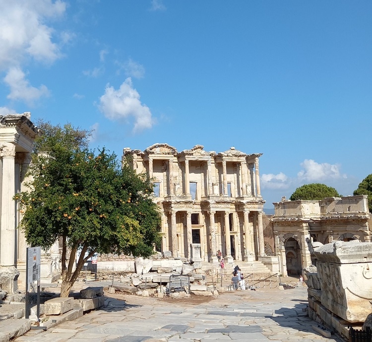 Местные гиды рассказывают — напротив библиотеки, чуть левее, располагался бордель; здания соединял подземный ход. На дороге из порта в центр города археологи нашли рекламу публичного дома. На мраморной плите выбиты: разбитое сердце, монета, левая ступня, девушка в короне. Читается примерно так: если у тебя сердечная рана, но есть деньги — иди налево, тебя ждет женщина прекрасная, как королева. По поверью, отсюда пошло выражение «ходить налево».
