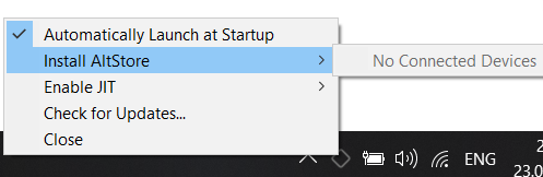 - Запускайте AltServer, когда iPhone подключён к компьютеру, и проверяйте, что в трее (на Windows) или в верхней панели (на Mac) выбран пункт «Install AltStore» или «Refresh All Apps» (Обновить все приложения).