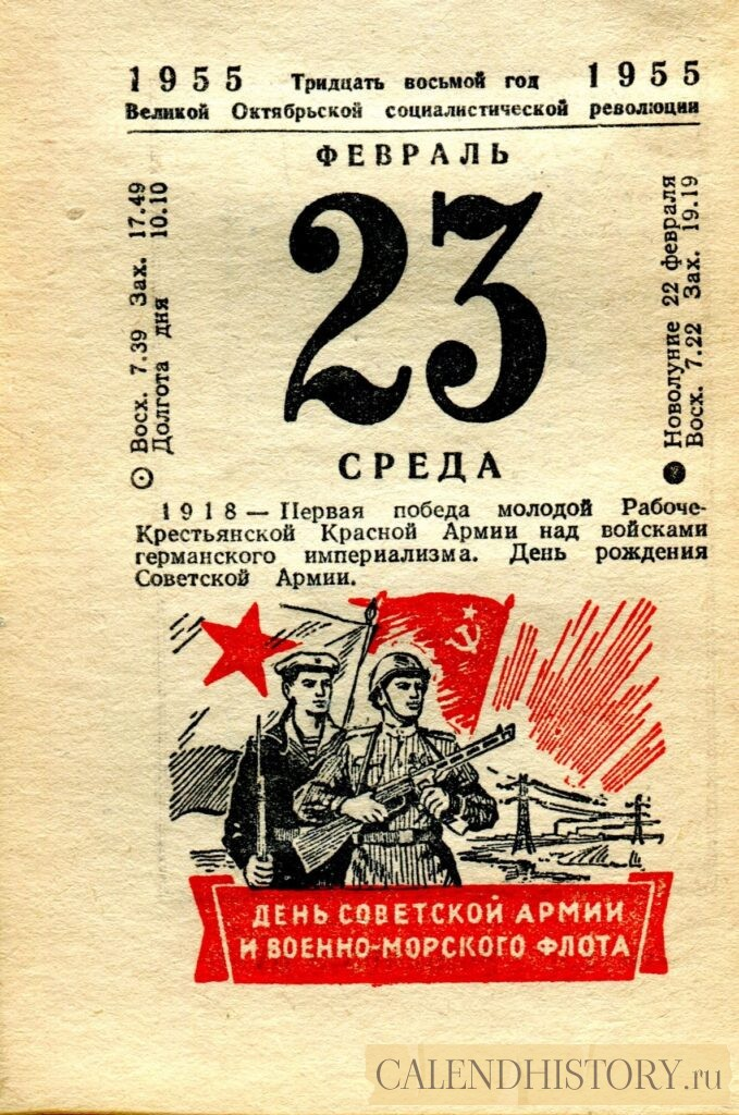 Итак, сегодня 23-го февраля и у нас на календаре 1955-й год. Перед нами листок советского календаря Политиздата. На календаре у нас среда - 23 февраля 1955-го года. ДЕНЬ СОВЕТСКОЙ АРМИИ И ВОЕННО-МОРСКОГО ФЛОТА 1918 — Первая победа молодой Рабоче-Крестьянской Красной Армии над войсками германского империализма. День рождения Советской Армии. *** Оборотную сторону листка этого календаря можно посмотреть у нас по ссылке на сайте. Другие листки советских календарей смотрите у нас на сайте - CALENDHISTORY.ru ПОСМОТРИТЕ ЕЩЁ ЛИСТКИ ОТРЫВНЫХ КАЛЕНДАРЕЙ: