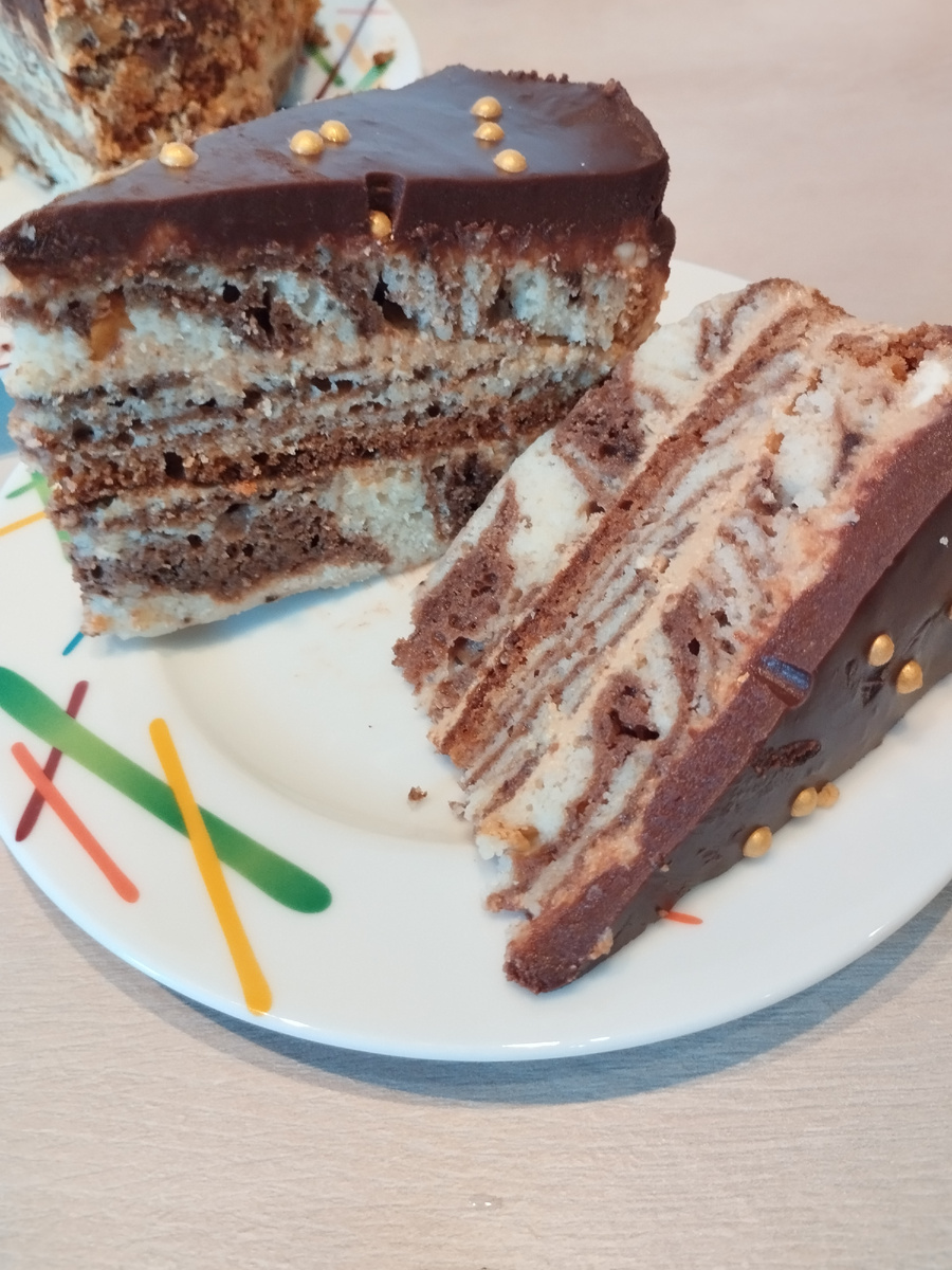 При делении бисквита на коржи целостность "зебриных" полосок, конечно, теряется, но, всё равно, получается симпатичный мраморный рисунок.