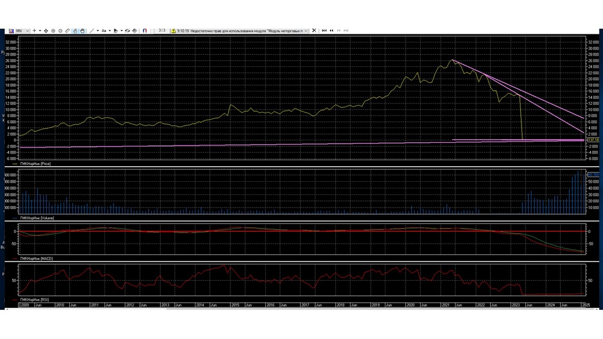 Месячный график показывает, что акция ГМКНорНик после дробления в 2023 году находится на дне своего уровня. Акция по настоящее время находится в боковом движении длительное время, без признаков разворота наверх.