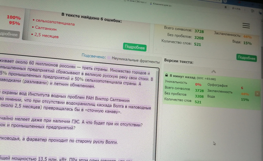 На камышинское медиаполе редактор местного сайта "Инфокам" Леонид Смелов выбросил сегодня, 22 февраля, новую порцию этико-публицистических "нечистот". Статью о Волге (https://infokam.su/chto-budet-esli-ubrat-plotiny-na-volge.html), авторство которой Леонид Смелов во всеуслышание приписал себе, не проходит никакой проверки на литературных "детекторах лжи": сервисы антиплагиата в Сети показывают, что вся статья списана у других авторов и имеет нулевую уникальность.
