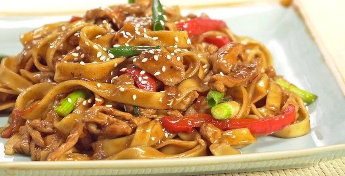 Если хочется приготовить что-то сытное и необычное, попробуйте лапшу удон с мясом и овощами в соусе терияки. Лапша удон - 200 граммов Мясо (говядина, свинина или курица) - 300 граммов Болгарский перец - 1 штука Морковь - 1 штука Чеснок - 1 зубчик Имбирь - 1 чайная ложка (свежий или молотый) Растительное масло - 3 столовые ложки Соевый соус - 50 миллилитров Соус терияки - 120 миллилитров Соль - по вкусу Черный перец - по вкусу Перец чили - по желанию Кунжутные семечки - для подачи 1. Нарежьте мясо тонкими полосками и обжарьте на разогретой сковороде с растительным маслом до тех пор, пока не выпарится сок. 2. Добавьте нарезанную морковь и лук. Обжаривайте до мягкости овощей. 3. Положите в сковороду болгарский перец, нарезанный соломкой, и, если любите острое, немного перца чили. Готовьте еще пару минут. 4. Добавьте измельченный чеснок, имбирь, соевый соус и соус терияки. Хорошо перемешайте. 5. Влейте немного воды, накройте сковороду крышкой и тушите на слабом огне 2–3 минуты. 6. Отварит