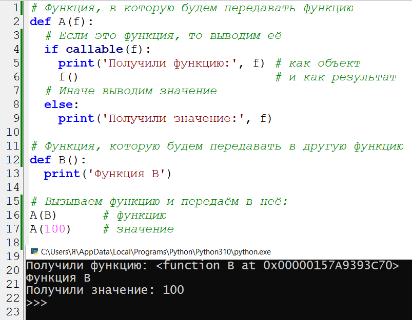 В Python, как и в некоторых других языках, в качестве аргумента в функцию можно передавать другую функцию. Однако при этом следует помнить, что функция, принимающая значение, может воспринимать это по разному. То есть при передаче функции в функцию передаваемая функция может быть воспринята принимающей функцией: Пример: Здесь у нас есть две функции - А и В. Функция В просто выводит какую-то строку. А вот функция А принимает параметр, и этим параметром в Python может быть что угодно. Поэтому в теле функции А мы сначала проверяем, является ли параметр функцией (проверяем с помощью callable()), а потом уже решаем, что с этим делать. Если это функция, то мы выводим её на экран в двух видах: f - как объект f() - как результат выполнения функции В первом случае будет просто выведено названия объекта. В нашем случае это функция и адрес этой функции. Во втором случае будет выведен результат работы функции. И поскольку мы в функцию А передали функцию В, то будет выведен результат выполнения фун
