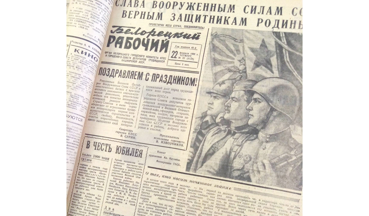 В праздничном номере тоже подборка новостей о перевыполнении производственных планов ко Дню Красной Армии: «Коллективы цехов и участков Белорецкого металлургического комбината решили ознаменовать День Красной Армии перевыполнением планов. 23 февраля они салютовали Родине и Красной Армии новыми производственными успехами. Доменщики в этот день выполнили план на 104,9 проц., туканские горняки – на 114,9 проц., коллектив проволочного стана прокатного цеха – на 119,5 проц., коллектив механического цеха № 2 дал 133,3 проц.».