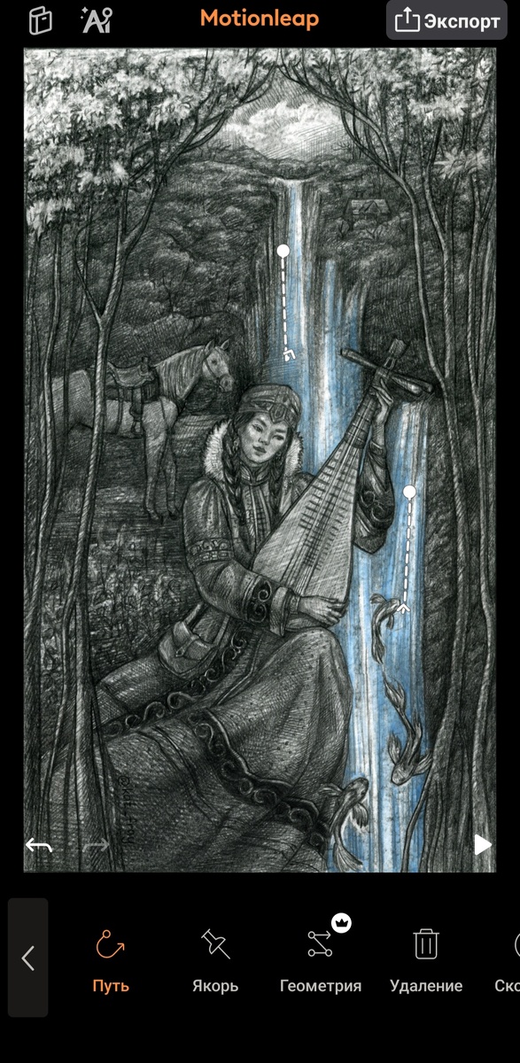 Мало красиво нарисовать, надо еще и красиво презентовать свою работу. Онлайн это сделать куда сложнее, чем в жизни, т.к. в реальности рисунок смотрится совсем иначе. Не зря говорят, что картины надо смотреть в живую! А впечатление от просмотра с экрана телефона или компьютера остаются смазанными. Вот и думаю я, а как зрителя заинтересовать, передать атмосферу и задумку работы? Сегодня на примере одной из своих иллюстраций, я покажу, как оживила ее с помощью приложения Motionleap. Вы уже видели мой ролик с данным рисунком. Итак. Открываю приложение и выбираю графу > новая работа и загружаю рисунок. Далее меня интересует раздел анимация. (Рекомендую поизучать и другие, там есть что-то интересное. Многое правда доступно только в платной версии, но и бесплатно есть возможность добавить интересных эффектов, эксперементируйте!) А я тыкаю анимация > путь И далее стрелочками обозначаю направление движения, что у меня должно анимироваться. В данном случае вода. Нажимаем стрелочку справа внизу и