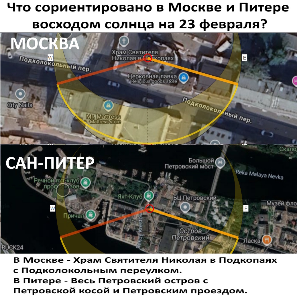 Что сориентировано в Москве и Питере восходом солнца на 23 февраля? В Москве - Храм Святителя Николая в Подкопаях с Подколокольным переулком. В Питере - Весь Петровский остров с Петровской косой и Петровским проездом.
