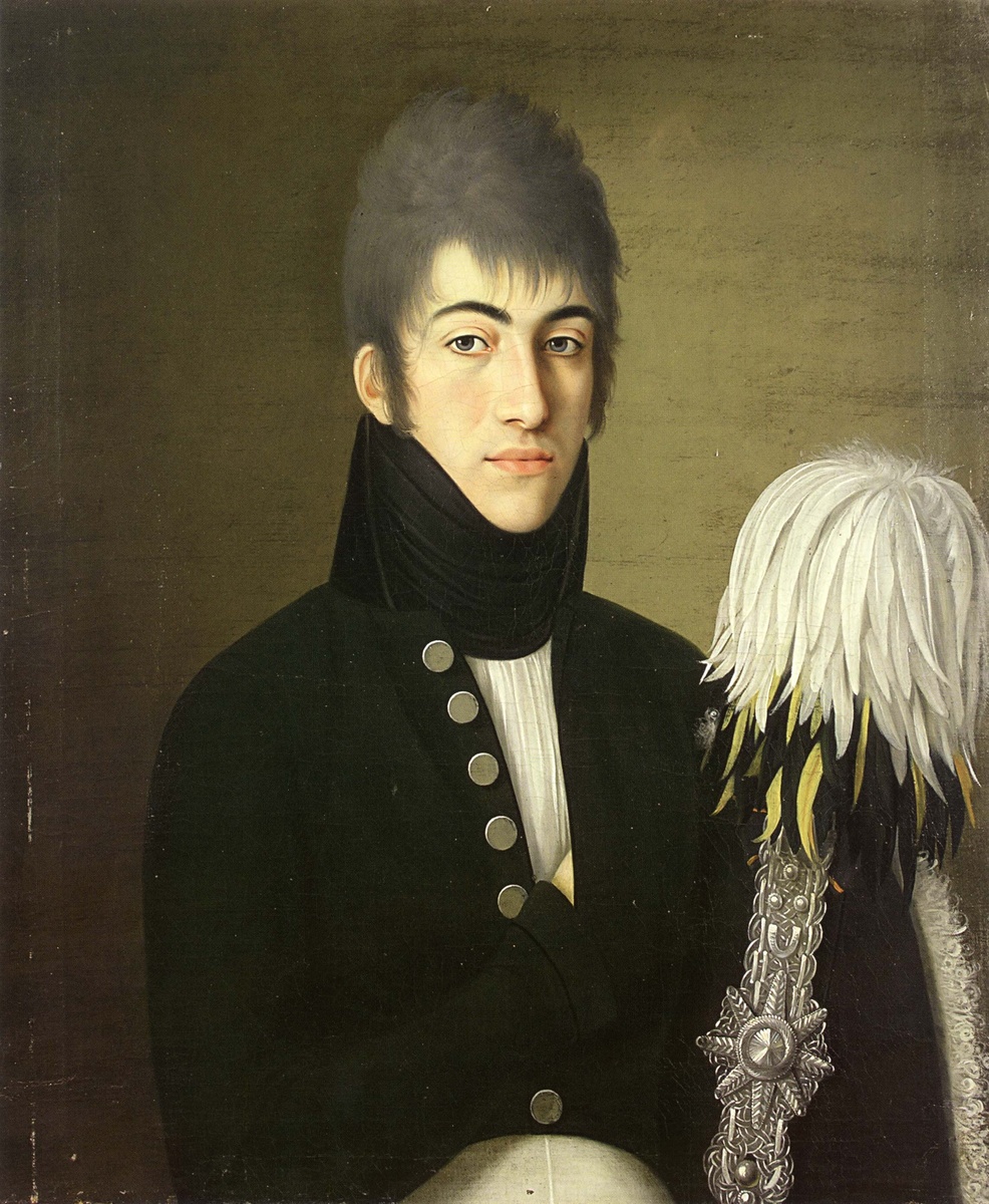 Всем знакомым с многочисленными на Дзене материалами из серии «Амурные тайны Романовых», безусловно, известен портрет офицера-кавалергарда Алексея Яковлевича Охотникова (1780-1807). А.Я. Охотников вошел в историю прежде всего как (предполагаемый) возлюбленный императрицы Елизаветы Алексеевны, жены Александра I, возможный отец ее ребенка. Одеяние Алексея Яковлевича на портрете я всегда идентифицировал как «ранний», то есть начала александровского царствования, темно-зеленый (не «парадный», в отличие от красного) вицмундир Кавалергардского полка. В недавно мною раздобытом сборнике материалов второй конференции «Габаевские чтения» есть статья О.Г. Леонова и Г.В. Протасенко, которая в целом подтверждает такой мой вывод. С той разницей, что в регламентирующем документе 1802 г., устанавливающем такой предмет одежды, он назван не вицмундиром, а сюртуком («сертуком»). Он имел фрачный покрой (!) и был однобортным. Таким образом, в этот период термин «сюртук» употребляется в России в том же знач