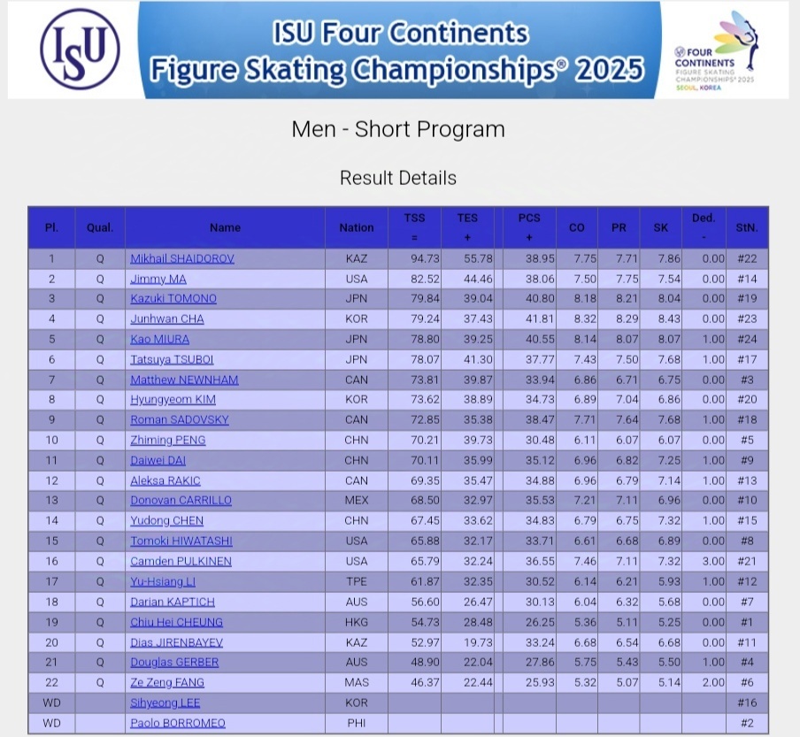 Повзрослевший айдол Джун Хван Ча становится по-настоящему крупной фигурой в фигурном катании - каждый год получает медаль на крупном турнире. Недавно выиграл Азиатские игры, но тут пришлось выступать после техничного проката Михаила Шайдорова. Сорвал четверной сальхов (получился только двойной). Каскад из тройного лутца и тройного риттбергера. Напоследок тройной аксель. Поэкспериментировал с музыкой. Оценка - 79.24 балла и четвертое место. Кадзуки Томоно открывал сильнейшую разминку. Яркий мозаичный костюм, как у матрешки, с кучей блестящих нитей и музыка с островными этническими мотивами и немного хип-хопа, сложными для восприятия европейцев. Начал с каскада из четверного и тройного тулупов, затем сдвоил сальхов, тройной аксель. Энергичные движения не совсем вписываются в музыкальное сопровождение. Технически он не прогрессирует, а только теряет баллы на сорванных элементах. Оценка - 79.84 балла. Американцу Джимми Ма как воздух необходимо внимание публики: на старте - грудь кол