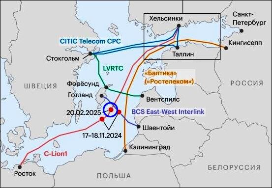 20 февраля повреждён кабель связи C-Lion 1 между Финляндией и Германией в районе шведского острова Готланд, синий кружочек На сайте шведской полиции 21 числа появилось такое сообщение: Полицейское управление начало предварительное расследование предполагаемого обрыва кабеля в Балтийском море в пределах шведской экономической зоны. Предварительное расследование по факту предполагаемого саботажа было начато для того, чтобы полиция могла получить доступ к инструментам, необходимым для выяснения того, что произошло и является ли травма новой или старой. В настоящее время подозреваемых нет. Мы сотрудничаем с соответствующими органами и на данный момент не имеем дополнительной информации." А шо такое произошло - как это, нет подозреваемых? Во всех предыдущих случаях первым подозреваемым являлась Россия. Ну, и Китай вторым номером, причём с ним-то всё было доказано, в отличие от России. Но вот интересный момент, Не далее, чем 8 февраля был повреждён российский кабель Ростелекома, проложенный