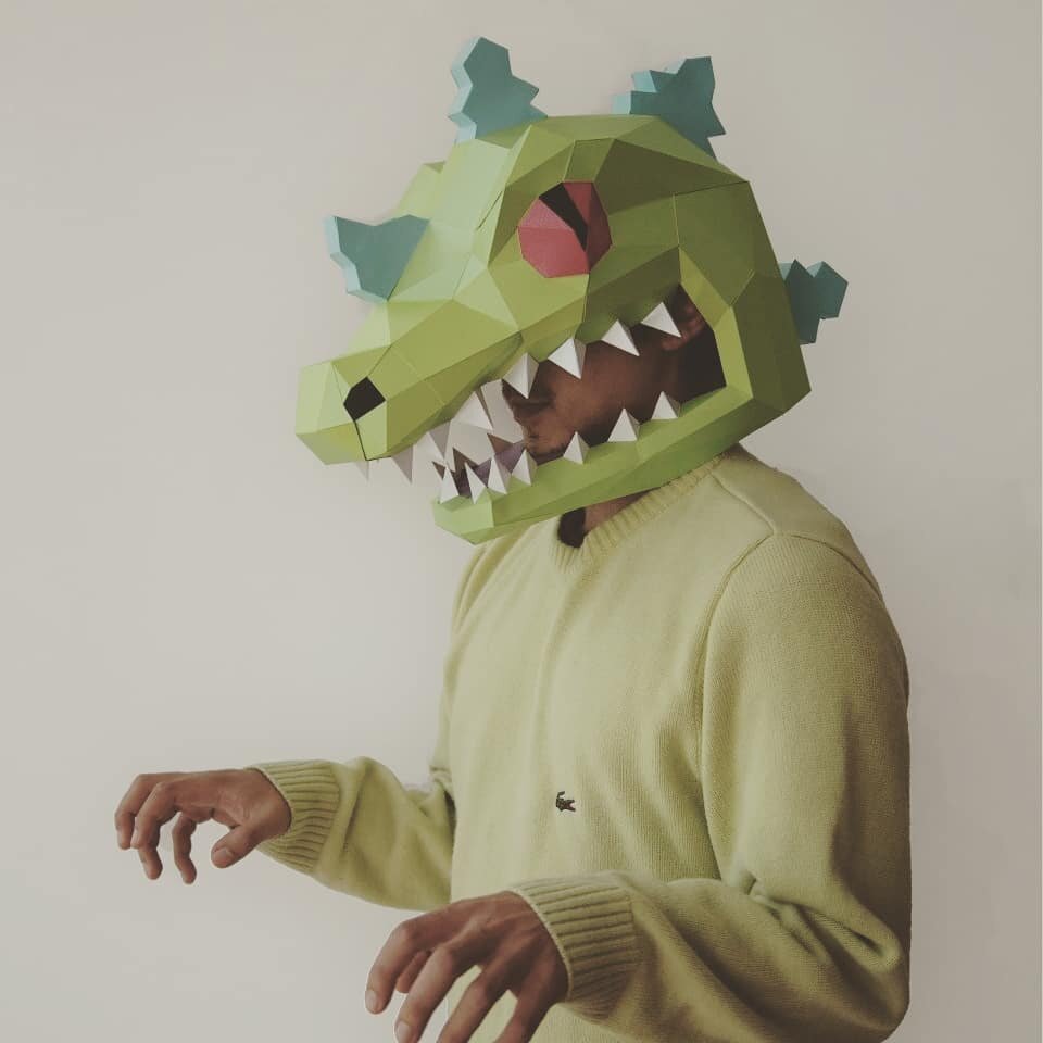 Паперкрафт – это уникальное искусство создания объемных моделей из бумаги, и маска динозавра, представленная на фото, яркий тому пример. Эта впечатляющая полигональная модель превращает своего владельца в настоящего хищника, добавляя образу стильный и необычный акцент. Описание модели Маска полностью закрывает голову, повторяя черты хищного динозавра. Она выполнена в ярко-зеленых оттенках с острыми зубами, красными глазами и небольшими синими шипами на голове. Форма напоминает знаменитого раптора, одного из самых узнаваемых динозавров в поп-культуре. Благодаря полигональному дизайну маска выглядит футуристично и креативно, а бумажные грани создают эффект 3D-модели. Несмотря на сложный вид, она собирается из отдельных частей по инструкции, что делает процесс создания увлекательным и доступным даже для новичков. Где использовать такую маску? Создание такой маски – не только возможность проявить творческий подход, но и шанс удивить окружающих оригинальным дизайном. Скачайте шаблон, подгот
