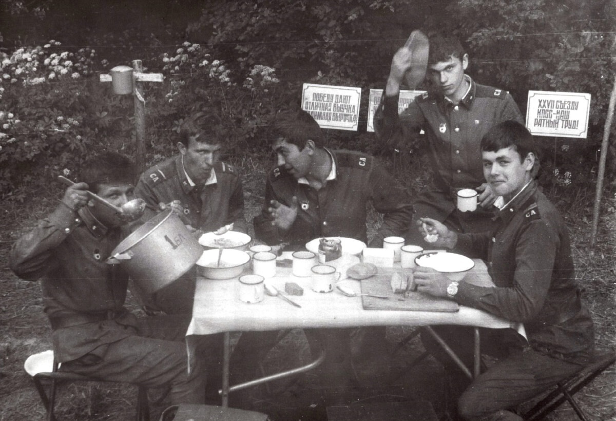 На обложке: Гвардейский экипаж тропосферной станции Р-410 ВПС принимает пищу на свежем воздухе, крайний справа — техник станции гв. сержант И.Н.Гусев, рядом с ним с пилоткой в руку стоит А.Пономаренко. На заднем плане приличествующие случаю лозунги: «Победу дают отличная выучка и взаимная выручка!», «Военная Присяга — клятва воина на верность Родине!» и «XXVII съезду КПСС — наш ратный труд!». ЛВО, лето 1985 года.
