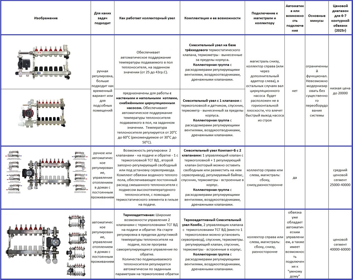 В статье и таблице ниже приведены все важные моменты которые необходимо учитывать при выборе обвязки. Известно что стоимость комплекта зависит от престижности Бренда и функциональных возможностей системы управления. Другими словами - покупая обвязку мы платим за комфорт который ожидаем от «тёплого пола» , который требует немало средств, времени и сил. Обидно не получить ожидаемый результат, сделав не верный выбор системы управления.