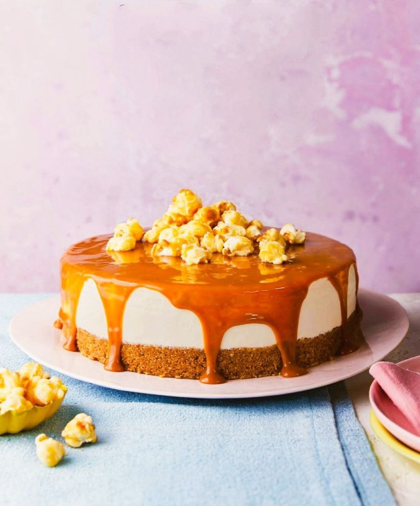 Предлагаю вам приготовить этот вкусный торт. Потребуется. Основа - 320 грамм печенья, 2 столовые ложки коричневого сахара, 150 грамм сливочного масла. Для начинки - 700 грамм сливочного жирного сыра, 300 мл жирных сливок, 100 грамм сахарной пудры, 3-4 чайной ложки карамельного экстракта, 150 грамм карамельных конфет, соль по вкусу. Для поливки торта - 200 грамм карамельного соуса, попкорн сладкий, соль по вкусу. Приготовление. Печенье измельчите до рассыпчатого состояния в кухонном комбайне. В большой миске смешайте крошки печенья с коричневым сахаром. Сливочное масло растопите и добавьте в миску с печеньем, хорошо перемешайте. Выложите массу в разъемную форму для выпечки и разровняйте по дну, чтобы образовался толстый слой. Форму поставьте в холодильник на 30 минут. Для сырного слоя смешайте сливочный сыр, сахарную пудру, соль, карамельный экстракт и перемешивайте миксером примерно 10-20 секунд. Добавьте сливки и продолжайте взбивать около 2 минут, пока смесь не начнёт застывать, он