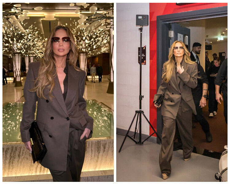 Каждое появление Дженнифер на публике сопровождается восторгом — то, как 55-летняя актриса и певица чувствует стиль, откликается многим! В этот раз она сделала ставку на трендовый Mocha Mousse и не прогадала. Лопес прибыла в ОАЭ, где у нее запланировано выступление на Saadiyat Nights, в оверсайз костюме Saint Laurent. Как видите, «офисная сирена» неплохо смотрится и в аэропорту! Внутри — классическая расстегнутая рубашка все того же шоколадного оттенка, на шее — бриллиантовое колье, в руках — клатч с крокодиловым принтом от нью-йоркского бренда Retrofête за $600 (чуть больше 53 000 рублей). Дополнили образ крупные солнцезащитные очки с линзами обмре и золотыми акцентами, а также туфли на платформе с открытым носком — любимая модель артистки. За блестящие наращенные ногти Джей Ло отвечает известный мастер по маникюру Том Бачик — его услугами пользуются Хайди Клум, Камилла Кабелло, Селена Гомес. Главный элемент образа — костюм. В таком вполне представляешь себя и на работе, и на родитель
