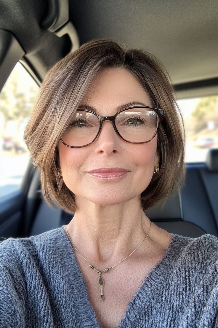 Насчёт длины — двояко. С одной стороны, в этом возрасте волосы тускнеют и слабеют, поэтому лучше сделать модную стрижку (например, боб) и ходить довольной. А с другой — если с волосами повезло и они по-прежнему крепкие и густые, можно просто уменьшить длину.