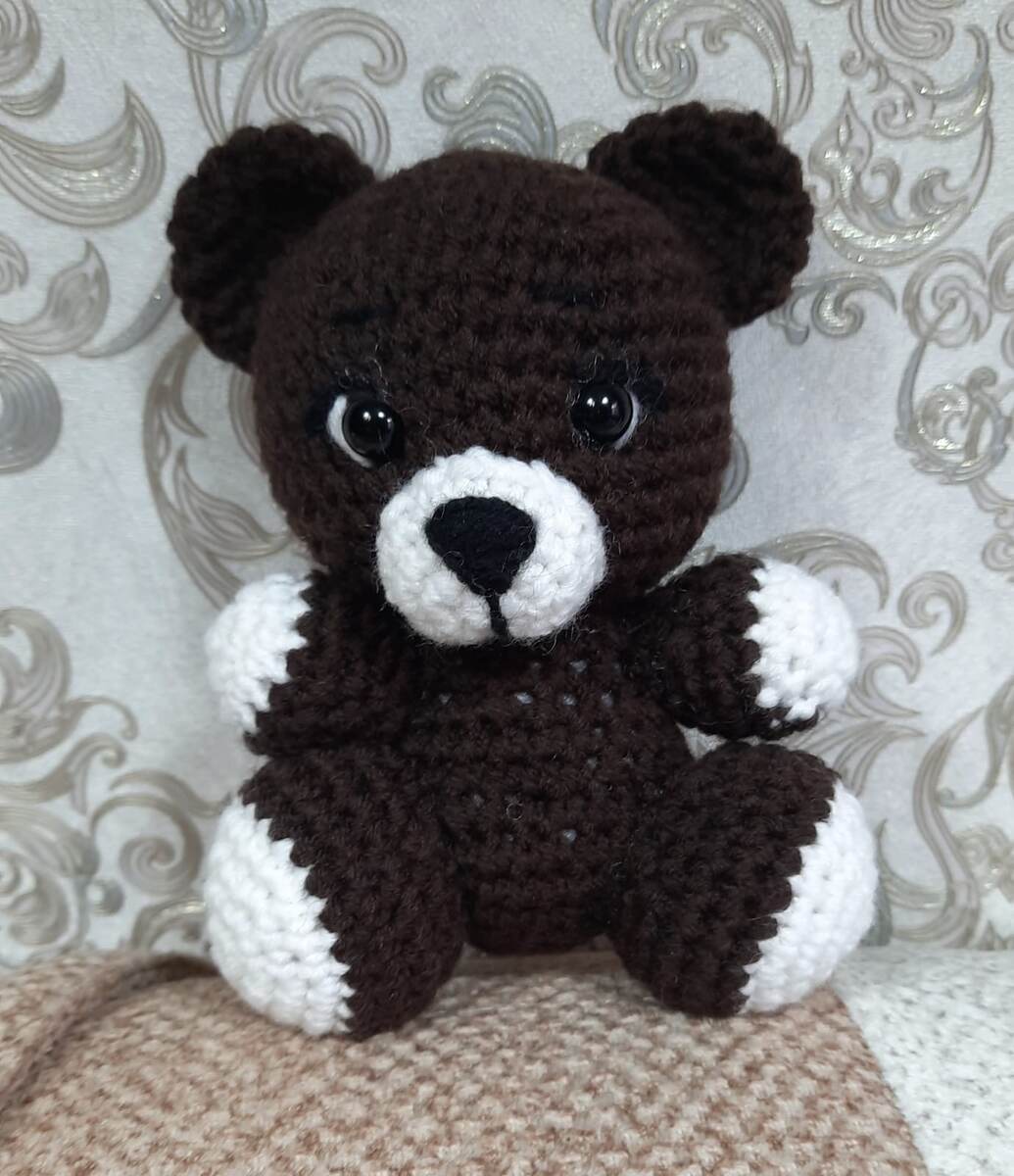 МК был найден в свободном доступе в интернете. В описание я внесла свои небольшие изменения и дополнения. Условные обозначения КА – кольцо амигуруми сбн столбик без накида пр – прибавка уб – убавка Я вязала пряжей ALIZE LANAGOLD CLASSIC, крючком №3 55 – белый 26 – коричневый Черный – более тонкая пряжа Глазки на безопасном креплении 10мм Наполнитель (у меня холофайбер) Голова (коричневый цвет) 6 сбн а КА 1 ряд в каждую петлю по 2 сбн (12 сбн) 2 ряд (1сбн,пр)*6 (18 сбн) 3 ряд (2сбн,пр)*6 (24 сбн) 4 ряд (3сбн,пр)*6 (30 сбн) 5 ряд (4сбн,пр)*6 (36 сбн) 6 ряд (5сбн,пр)*6 (42 сбн) 7 – 12 ряды 42сбн 13 ряд (5сбн,уб)*6 (36сбн) Между 11 и 12 рядами вставила глазки на безопасной застежке. Между глазками 6 петель 14 ряд (4сбн,уб)*6 (30сбн) 15 ряд (3сбн,уб)*6 (24сбн) 16 ряд (2сбн,уб)*6 (18сбн) 17 ряд (1сбн,уб)*3 (15сбн) Оставила нить для пришивания. Набила голову наполнителем. Туловище (коричневым цветом) 6 сбн а КА 1 ряд в каждую петлю по 2 сбн (12 сбн) 2 ряд (1сбн,пр)*6 (18 сбн) 3 ряд (2сбн,пр)