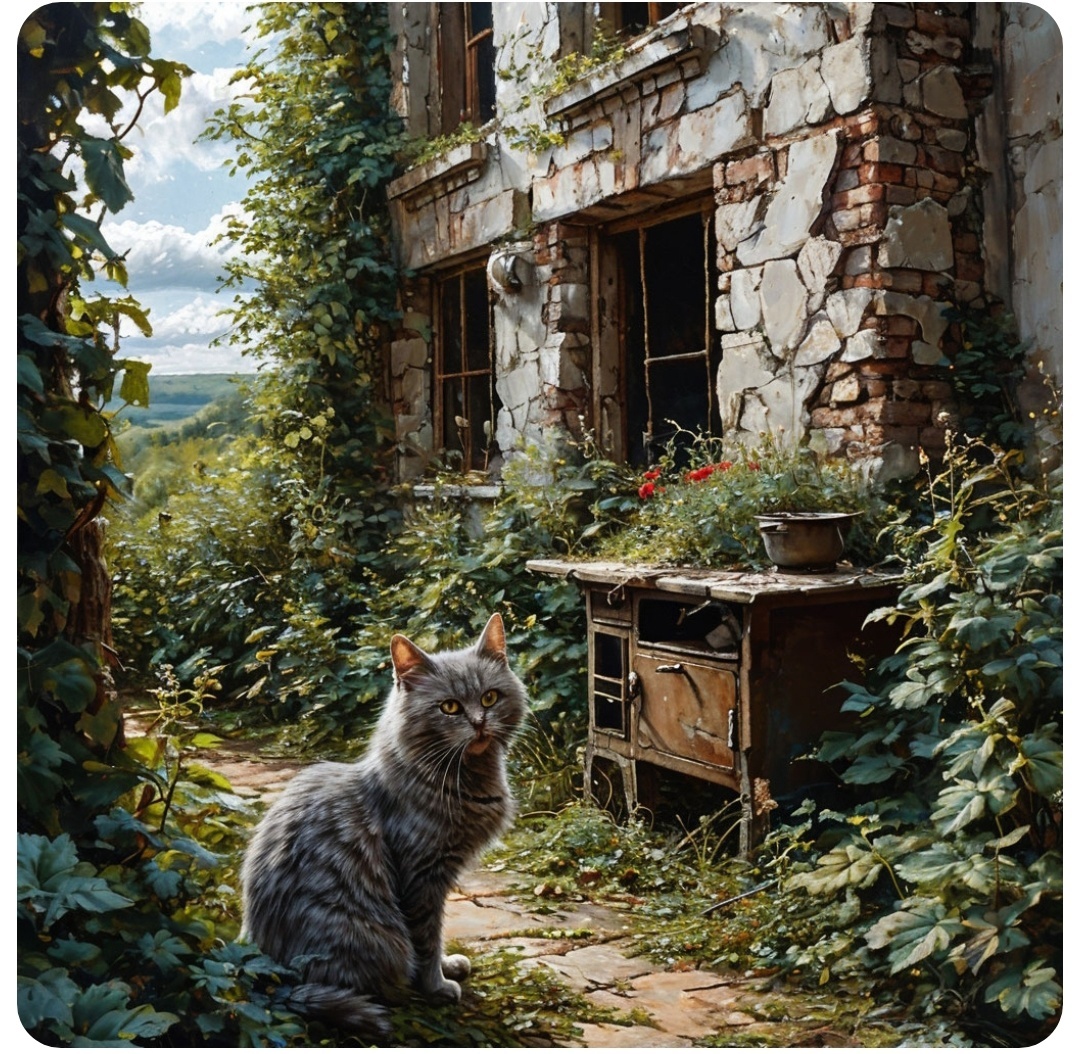 Оглядывая заросший участок, внимательно присматриваясь к каждому уголку и солнечному пятну, девушка внезапно заметила прижавшегося к печи облезлого серого кота.