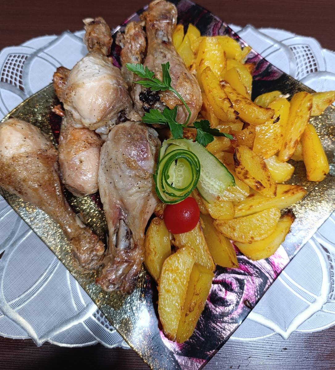 Ингредиенты: ножки курицы - произвольно картофель - произвольно соль - 1 ч л паприка - 1 ч л перец - 0,25 ч л гранулированный чеснок - 2 ч л майонез - 1-2 ст л масло растительное - 4 ст л Картофель очищаем, промываем и нарезаем дольками. В картофель добавляем паприку, соль, чеснок, масло. Перемешиваем. Выкладываем на противень. Курицу обмываем, добавляем майонез и перец. Перемешиваем. Далее вешаем курицу в шахматном порядке на решетку над картофелем. Выпекаем 1 час при температуре 155 градусов. Последние 10 минут можно добавить температуру, чтобы подрумянилось. Приятного аппетита!!!!!!