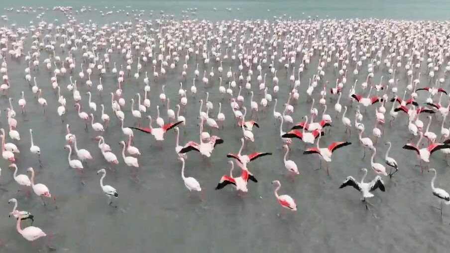 Сотни розовых фламинго пережидают зиму на побережье Каспийского моря в Хазарском государственном природном заповеднике Туркменистана. На кадрах, снятых с дрона, птицы разгуливают по воде и пролетают над морем. Фламинго занесены в Красную книгу Туркменистана и являются символом заповедника. Каспийское побережье привлекает птиц комфортным климатом и обилием питательных рачков и водорослей. Здесь животные остаются до марта-апреля и возвращаются в места гнездования. Площадь Хазарского заповедника — 270 тысяч гектаров, из которых больше половины занимает море, в нем обитают более 300 видов птиц. Фламинго распространены в Африке, на Южном Кавказе, Юго-Восточной и Центральной Азии, а также в Южной и Центральной Америке. ИСТОЧНИК: ГК Туркменистана по ТВ, радиовещанию и кинематографии