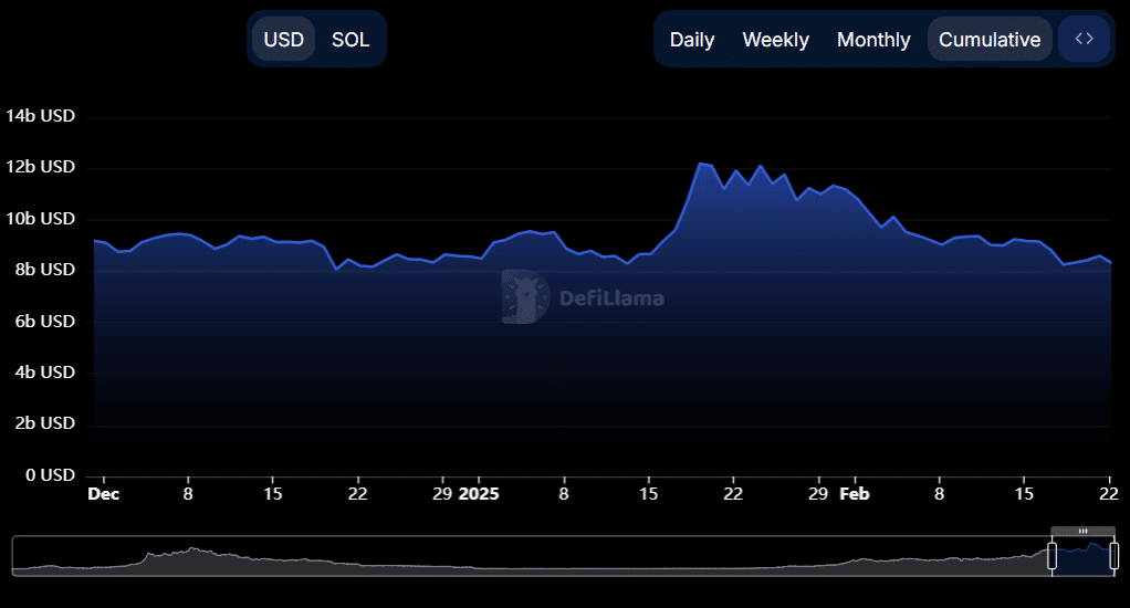 Из-за скандала с LIBRA и оттока ликвидности TVL Соланы однажды упал ниже $10 млрд. Хотя он немного восстановился до $10,3 млрд, с середины января он все еще ниже почти на 30%. Общая заблокированная стоимость (TVL) Solana [SOL] недавно достигла нового минимума в 9,9 млрд долларов США, снижение во многом связано с кризисом LIBRA, что еще больше усилило опасения относительно стабильности экосистемы Solana DeFi. Хотя TVL восстановился до 10,3 млрд долларов, он снизился почти на 30% по сравнению с серединой января. Это изменение, несомненно, усиливает сомнения относительно долгосрочного здоровья и перспектив роста Соланы. Поскольку Solana сталкивается с этими проблемами, все внимание приковано к тому, какое влияние это окажет на цену SOL и общие настроения рынка. TVL Соланы достиг нового минимума TVL Соланы резко упал в чартах, при этом недавнее падение опустило его ниже отметки в 10 миллиардов долларов впервые с ноября 2024 года. Это изменение типично для колебаний ликвидности экосистемы