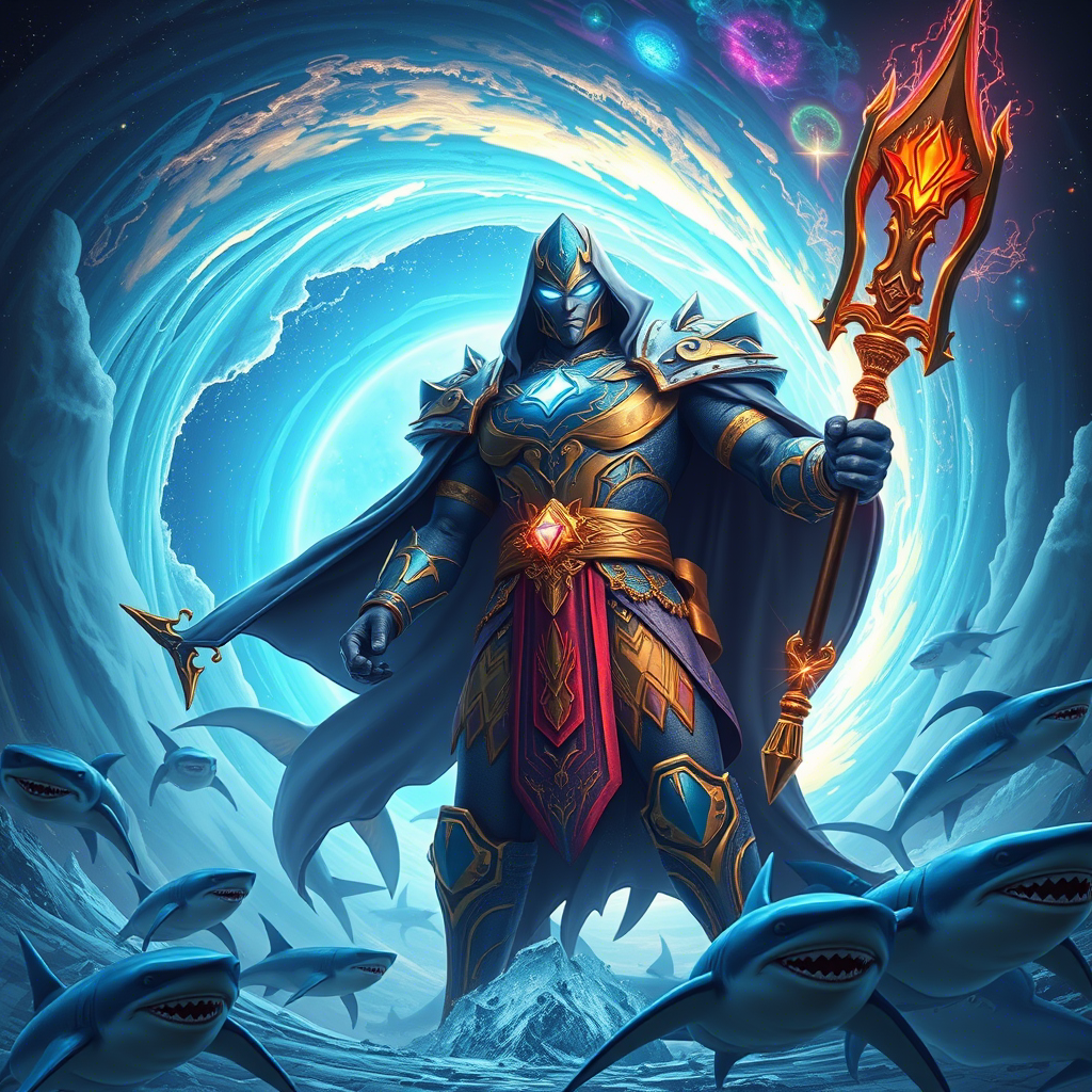 🌊 В центре стилизованного водоворота, где вода встречается с космосом, стоит величественный Космос — маг, чье имя олицетворяет бесконечность вселенной. Его образ, окруженный акулами и огненным посохом, стал символом силы и тайны. Но как он стал тем, кем является сейчас? Позвольте рассказать вам эту захватывающую историю. Космос был рожден в самом сердце океана, когда волны пели свои древние песни, а луна освещала поверхность воды своим холодным светом. Говорят, что его душа возникла из слияния воды и звездной энергии, что сделало его связующим звеном между двумя стихиями. Его доспехи, выполненные в сине-золотой цветовой гамме, символизируют его власть над водой и энергией. На груди виден символ, напоминающий волну, которая переплетается с галактикой — это знак его принадлежности к обеим стихиям. А светящиеся глаза под маской говорят о его проницательности и мудрости. 🔮 Однажды Космос услышал шепот воды, который вел его к загадочному порталу. Этот водоворот, переливающийся всеми оттен