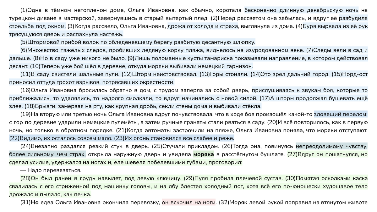 Сочинение по тексту В.П. Катаева «Одна в тёмном нетопленом доме, Ольга Ивановна, как обычно, коротала бесконечно длинную декабрьскую ночь...». Вариант 47 сборника ФИПИ-2025 (50 вариантов под редакцией Дощинского) В чём проявляется героизм человека на войне? Над этим вопросом предлагает задуматься В.П. Катаев. По мнению автора, героизм проявляется в самоотверженной защите Родины, в готовности пожертвовать собственной жизнью ради общей победы над врагом. Чтобы доказать свою мысль, В.П. Катаев описывает состояние моряка, который оказался последним выжившим в неравном бою. Молодой человек «был ранен в грудь навылет». Он с усилием держался на ногах, еле говорил «побелевшими губами», на его лбу «блестел холодный пот», его тело «дрожало и пылало, как печка». Становится очевидно, что моряк получил серьёзное ранение и находился в тяжёлом состоянии. Однако солдат решает вернуться на поле боя после перевязки. Он не слушает женщину, уговаривавшую его остаться и спрятаться, а с «насмешливо-ласковой