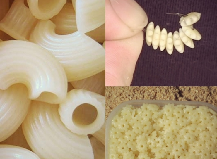 Весьма подходящей наживкой для рыбной ловли являются и макаронные изделия. Наиболее предпочтительными для рыбной ловли являются макароны типа "рожки" и "шестерёнки". Их стоит слегка недоварить, чтобы они лучше держались на крючке. Не лишним будет варить их в нерафинированном подсолнечном масле. Таким образом мы придадим насадке аромат, привлекающий рыбу, и защитим её от прилипания к стенкам кастрюли, где они варятся. На макароны ловят рыб семейства Карповые, таких как карась, густера, сопа, синец, лещ, карп, плотва и так далее.