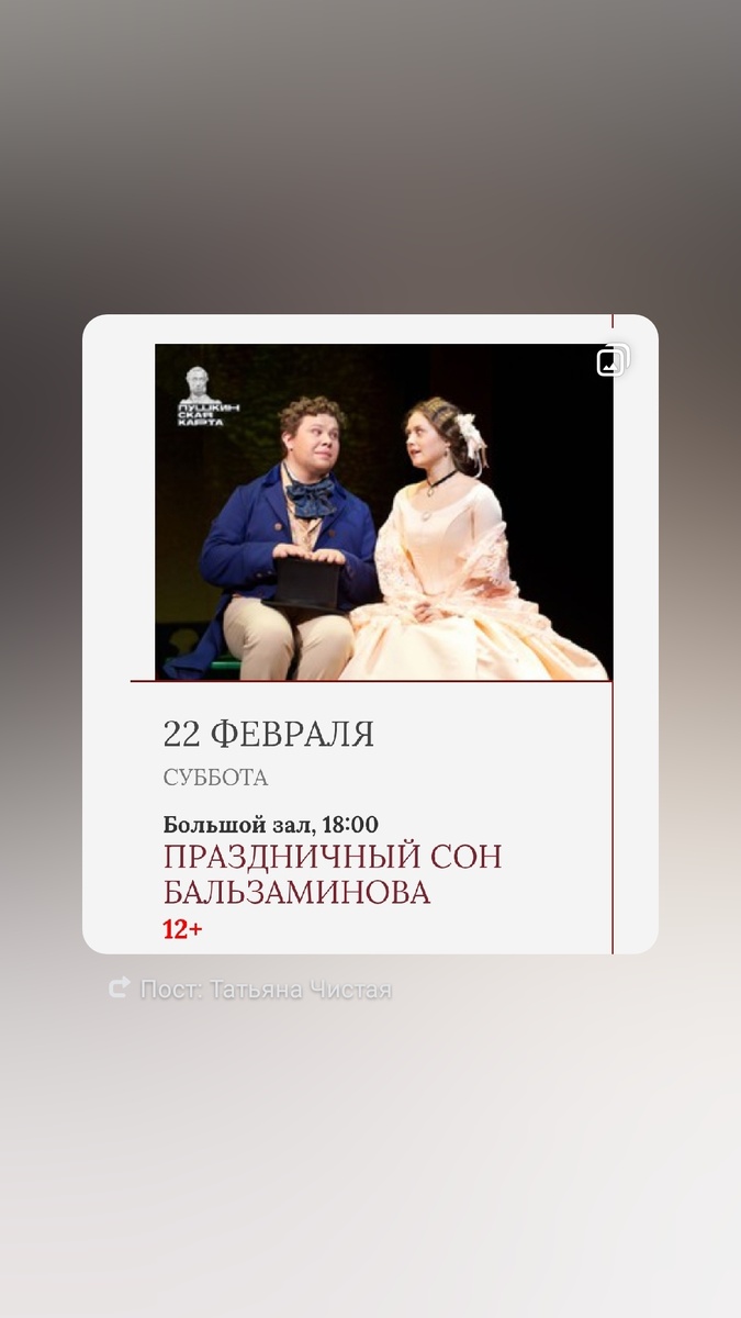 (по пьесе А. Н. Островского "Праздничный сон - до обеда") Режиссёр - Александр Савельев В центре Москвы на Сухаревской площади расположился настоящий волшебный дворец- сотканный из камня, стекла, витражей, зеркал, он занимает целых 5 этажей в 1 минуте ходу от метро Сухаревская. Абсолютно просторные фойе на всех уровнях дворца соединены винтовой лестницей с изумительными люстрами, а зеркальные поверхности делают здание ещё более атмосферным и воздушным. Портретная галерея украшает не только залы каждого этажа, но и винтовую лестницу, которая манит подняться на верхний, на потолке которого раскинулся настоящий вишнёвый сад! Уже после спектакля, покинув театр, мы задирали головы, как дети, и любовались подсвеченными витражами-флагами на фасаде здания - вишнёвый сад цвел на улицах зимнего города. Не пройдите мимо! Я редко пишу о персонале театров, но сегодня не могу не отметить приветливость, доброжелательность, дружелюбность всех сотрудников храма искусства, которая дополняет атмосф