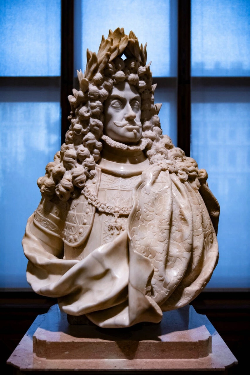 Мраморный бюст императора Леопольда I создан австрийским скульптором Паулем Штруделем в 1695 году. Этот портрет типичен для эпохи барокко: на императоре — драпировки и пышный парик, голова динамично повернута относительно плеч. Но внимание привлекает в первую очередь лицо Леопольда с невероятно длинным подбородком и выдвинутой вперед нижней челюстью — знаменитая особенность династии Габсбургов. Эти наследственные черты, свойственные многим представителям знатнейшего европейского рода, были признаками вырождения. К XVI веку Габсбурги правили всей Центральной Европой: помимо Австрийской и Священной Римской империи они воцарились в Испании и Португалии. В мире не существовало династии, которая могла бы сравниться с Габсбургами. Поэтому от поколения к поколению они заключали браки исключительно внутри собственного рода. Бюст работы Штруделя находится в венском Музее истории искусства. Там же висят портреты инфанты Маргариты художника Диего Веласкеса: именно Маргарита стала первой женой Лео
