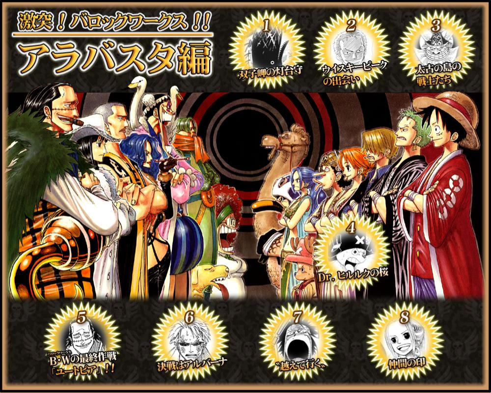Эти битвы демонстрируют рост силы каждого члена команды и их способность работать вместе. - Раскрытие планов Крокодила (Главы 191-200, Эпизоды 119-124):- Команда узнаёт, что Крокодил, лидер «Baroque Works» и Шихибукай, стоит за гражданской войной. Он использует засуху, чтобы настроить повстанцев против королевской семьи, и ищет древное оружие Плутона, спрятанное в Алабасте. Они также узнают, что Нико Робин, известная как Miss All Sunday, работает на Крокодила и имеет знания о Понеглифах.