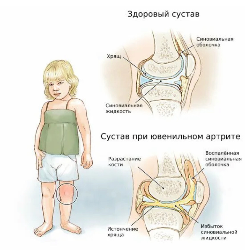 Ювенильный идиопатический артрит — воспаление одного и более суставов, которое обычно развивается на фоне лихорадки длительностью не менее 3 дней. При этом может появиться кратковременная эритематозная #сыпь, увеличиваются #лимфоузлы, #печень, #селезёнка, воспаляются серозные оболочки внутренних органов (брюшины, перикарда, плевры и др.). В некоторых случаях ювенильный артрит может вызывать задержку роста и развития. Например, #меняется форма #подбородка (скошенный подбородок) или длина конечностей (одна становится длиннее другой). Кроме того, у #детей с ювенильным артритом часто развивается иридоциклит — воспаление переднего отдела #сосудистой #оболочки #глаза. Как правило, он протекает бессимптомно или с лёгким ухудшением зрения, светобоязнью.