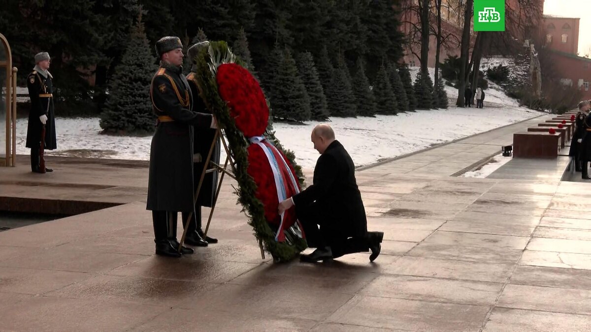 [ Смотреть видео на сайте НТВ ] Президент РФ Владимир Путин в День защитника Отечества в Александровском саду почтил память павших воинов. Военнослужащие установили у Могилы Неизвестного Солдата большой венок. Президент, преклонив колено, поправил ленту венка, а после в знак почтения склонил голову и постоял некоторое время у венка. В церемонии возложения также приняли участие военнослужащие, удостоенные звания Героя России, которые ранее сегодня получили награды из рук президента, и министр обороны Андрей Белоусов. Ранее сегодня Путин поздравил сограждан с 23 Февраля. Особые слова президент адресовал участникам спецоперации, которые решительно отстаивают родную землю, национальные интересы и будущее страны. [ Смотреть видео на сайте НТВ ]