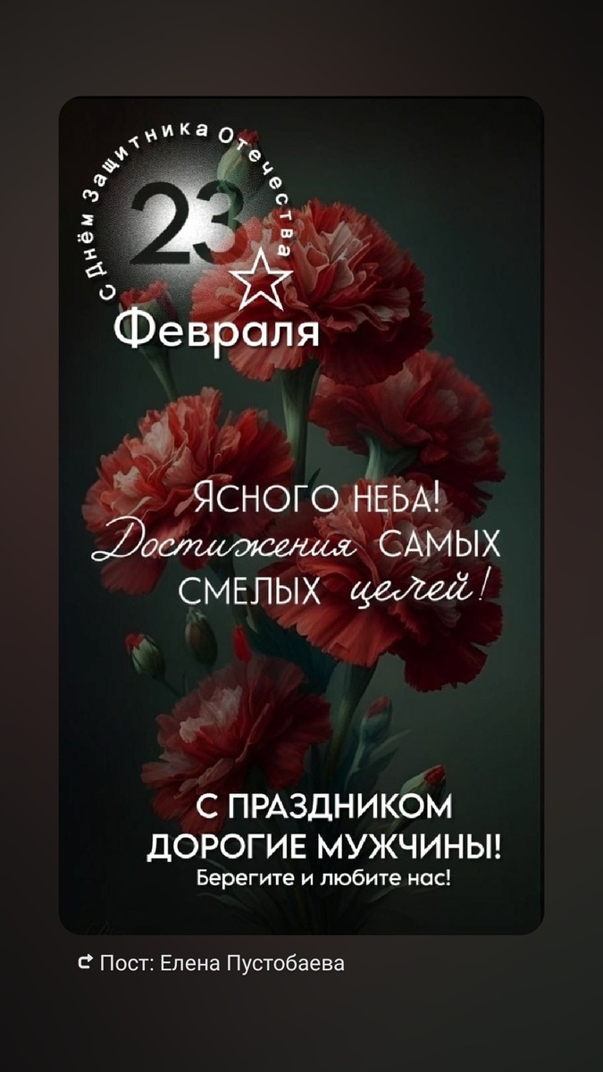 Приветствую всех читающих эту статью . Хочу поздравить наших мальчиков , мужчин . С праздником вас и конечно же нас, с днём защитника отечества . Мужчины, оставайтесь мужчинами . Как не банально это звучит,но бутьде мужественны. Как иногда не приятно смотреть, мужской пол, который становится женским. Я считаю , что даже самый маленький мужчина( допустим сын или внук) , проявляющий такие качества как дружба, преданность и смелость , выглядит более выигрышно, чем некоторые.... Я очень уважаю военных , которые защищают Родину и нас от бед. Очень хочется , чтобы вы оставались здоровыми, всегда возвращались домой целыми и невредимыми. А мы в свою очередь , будем вдохновлять вас в тылу. Так же хочется поздравить и милых дам, которые относятся к несению службы . Ну и конечно же всех женщин, которые родили сыновей,вырастили их достойными и правильными. Так что этот праздник ,не только мужской,но женский. По этому , примите поздравления все, кто считает себя причастным к этому празднику . М