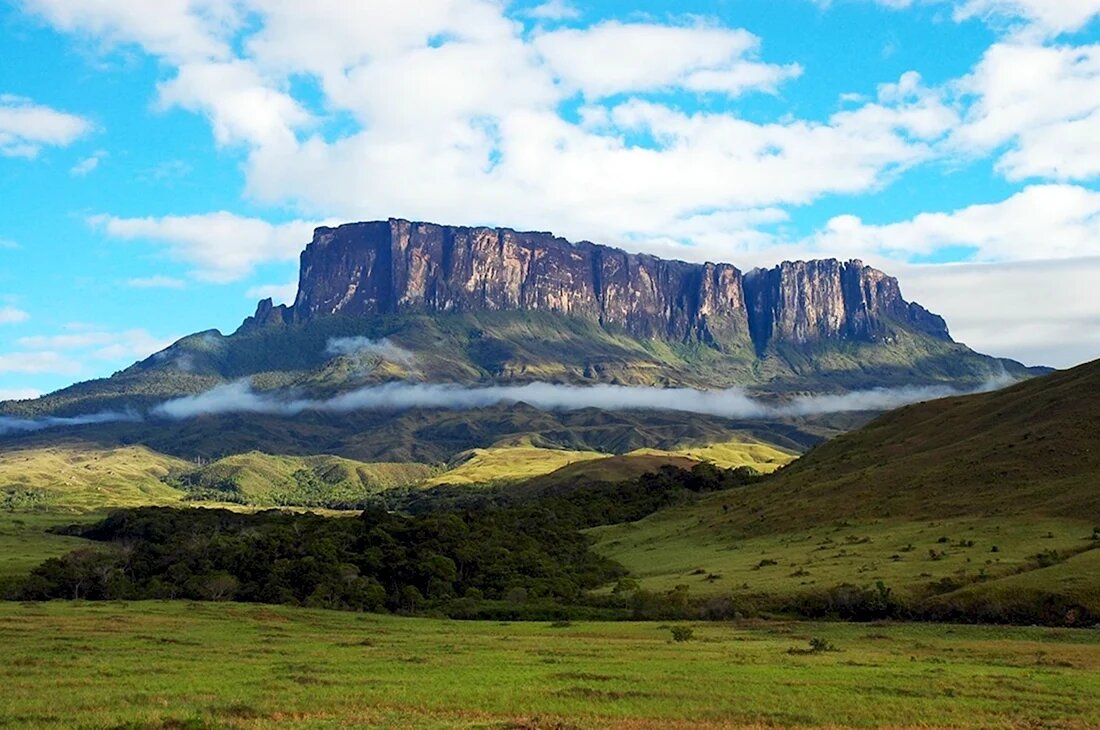 - Рорайма – это гора на границе трёх стран: Бразилии, Венесуэлы и Гайаны. Но её вершина не острый пик, а укутанное дымкой облаков плато с перпендикулярно отвесными стенами. Площадь плато 34 квадратных километра. Там растут уникальные растения и текут живописные водопады. Путешественники рассказывают, что людей на плато Рорайма охватывает священный трепет.