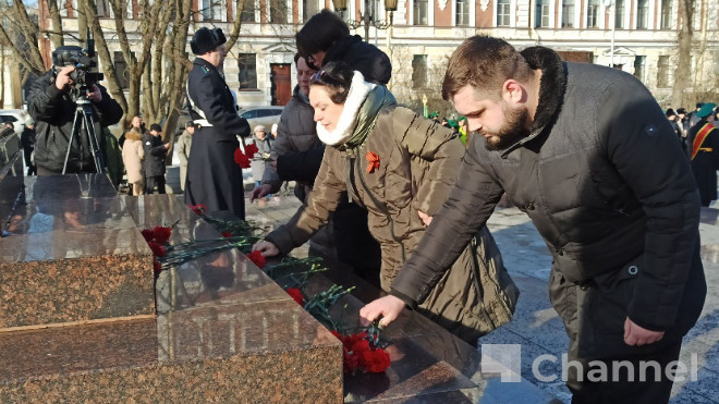 Жители Выборга возложили цветы к стеле “Город воинской славы” в рамках акции “Подвигу жить в веках!”